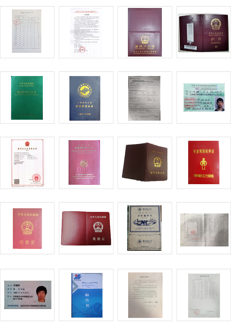 各類公證書、委托書、出國(guó)材料、合同公證、錄取通知書、在讀證明、學(xué)歷證書、學(xué)歷證、學(xué)位證書、學(xué)位證、學(xué)歷公證、畢業(yè)證、畢業(yè)證書、會(huì)計(jì)證、成績(jī)單、戶口簿、證明材料、死亡證明、身份證、單身證明、健康證、許可證、營(yíng)業(yè)執(zhí)照、護(hù)照、駕照、簽證、移民、移民材料、移民資料、邊境證、出入境證件、結(jié)婚證/離婚證、婚姻證明、無犯罪證明、出生證、資格證書、涉外公證、委托公證、收入證明、房產(chǎn)證等等。